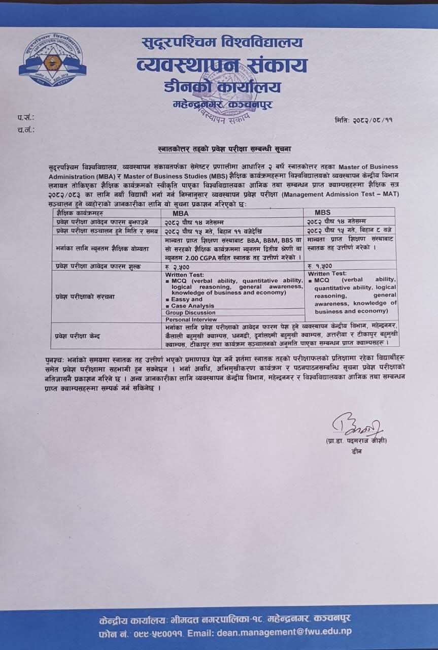 MBA(MAT) Entrance Exam Notice
