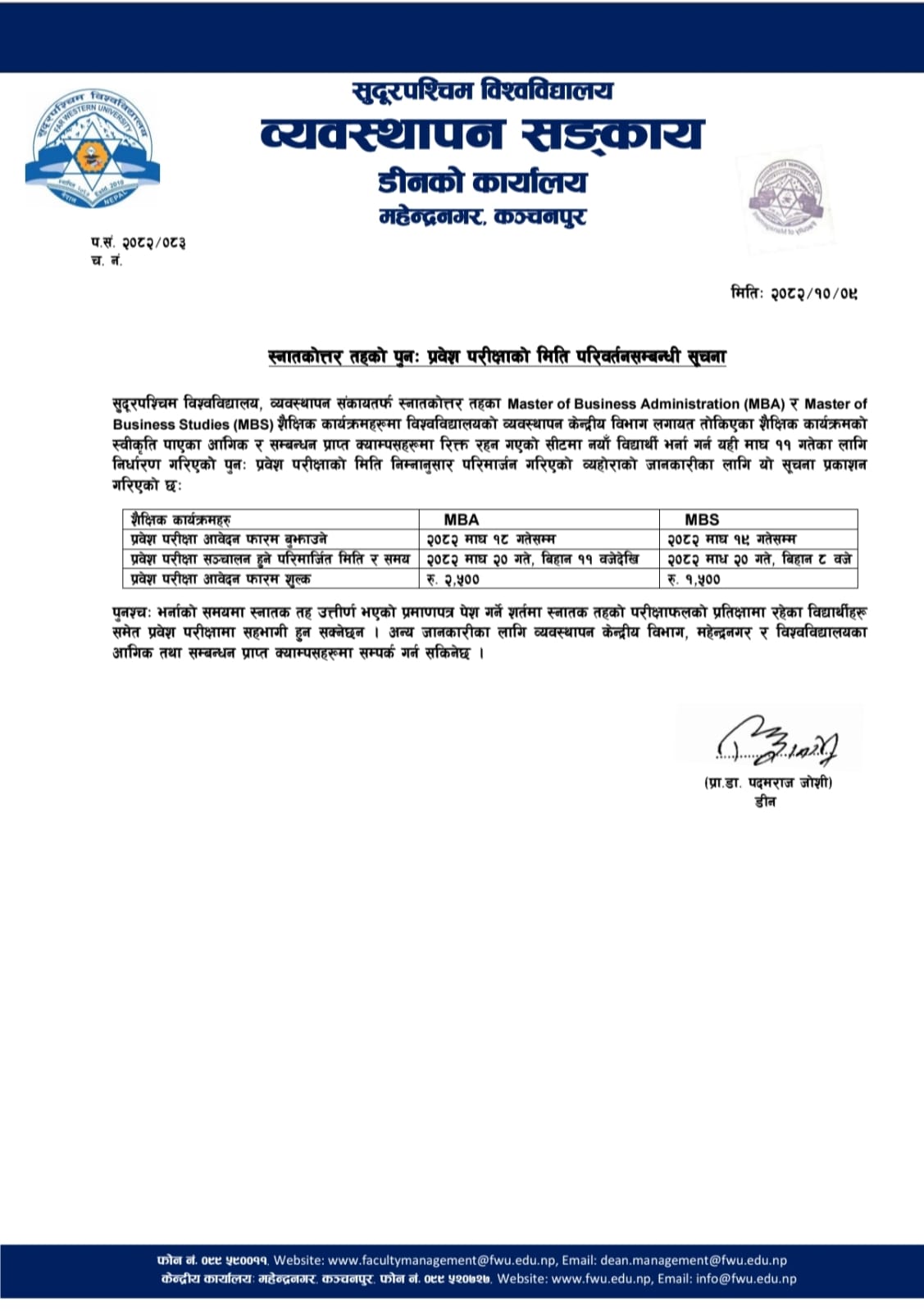 MBA & MBS Re-Entrance Exam Date Change